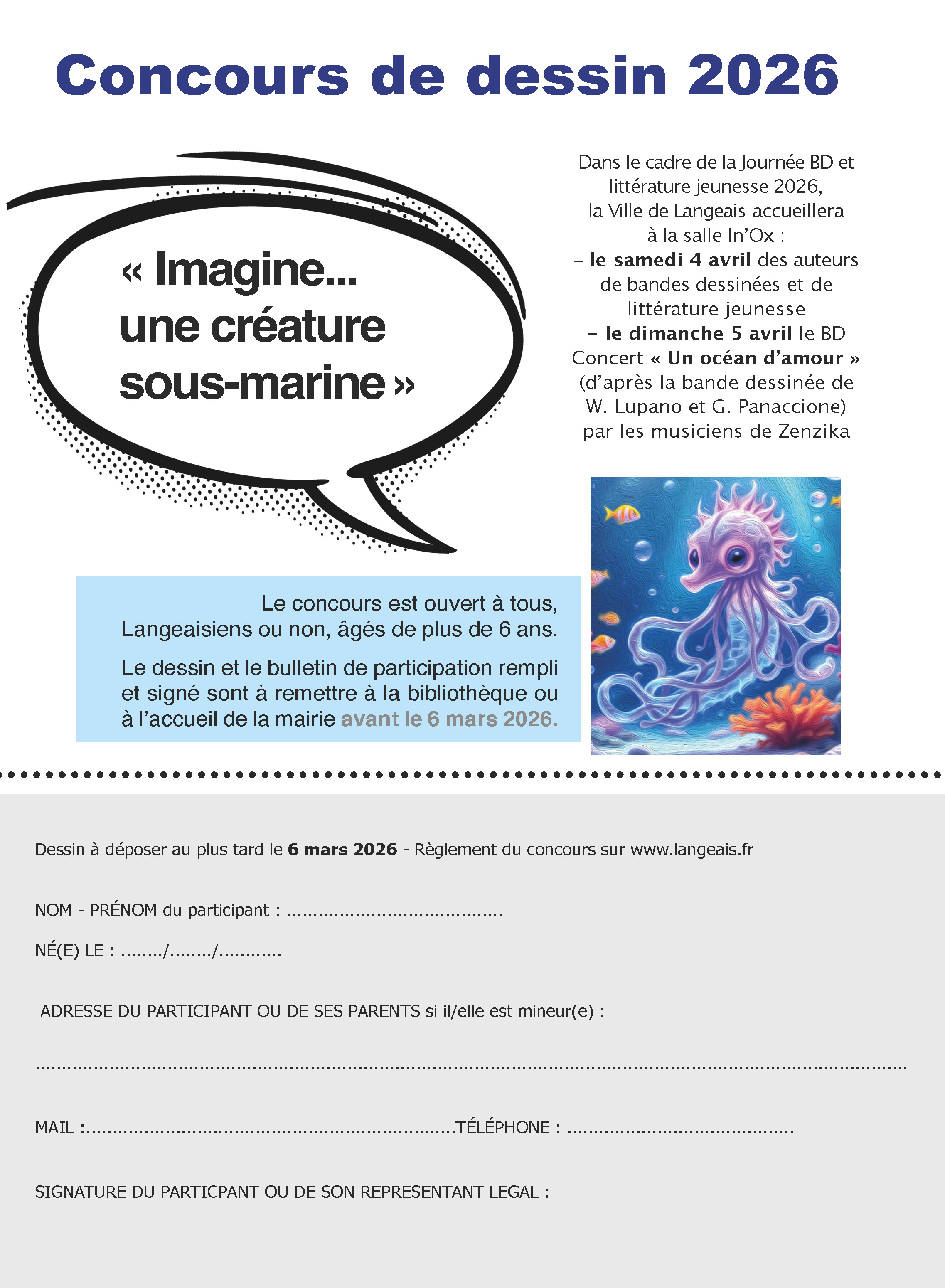 Le dessin avec son bulletin de participation rempli et signé, que vous trouverez ici ou en images jointes, sont à remettre à la bibliothèque ou à l’accueil de la mairie avant le 6 mars 2026.