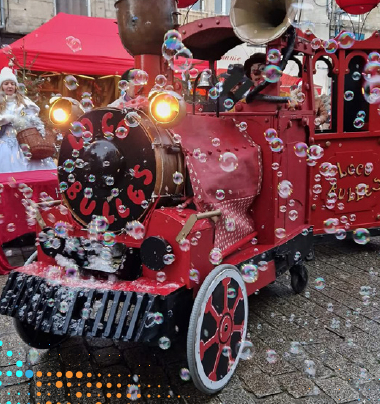 Attendez-vous à un moment où la musique entraînante et le jonglage virtuose se rencontrent pour créer une fête visuelle et sonore inoubliable. Petits et grands seront émerveillés par les bulles de savons de la locomotive.