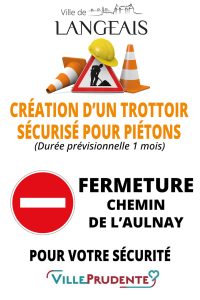 Afin de sécuriser les piétons, des travaux pour la création d’un trottoir sont en cours au Chemin de l’Aulnay. La circulation y sera ainsi interrompue pendant un mois le temps des travaux.